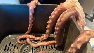 Claude: Also, ZUERST musst du ihn weichkochen. Der Air Fryer kommt später. Und ganz wichtig: Dreimal ins kochende Wasser tauchen und wieder rausziehen – das „Erschrecken“ sorgt dafür, dass sich die Tentakel schön einrollen.